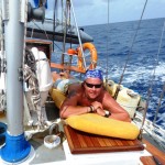 2355 – O 2330 czasu jachtowego na szerokości 03.10N i długości 26W mamy go. Wiatr SE3. Mamy nadzieję, że oznacza to regularny pasat. Do 1800 niebo przez cały czas zasnute chmurami a ilość wody lejącej się z nieba nie do opisania. Wiatry do tej godziny generalnie z połówek zachodnich a raczej nazwać je trzeba wicherkami od 2-6 knt. 2 godziny przed końcem wachty deszcz się skończył i prawie zdążyłem wyschnąć zanim zszedłem spać. Schodziłem to wiatr w porywach osiągał 2 knt. I tak samo przez następne 2 godziny zanim ustabilizował się w pasat. Lecimy ponad 6 węzłów ale nawet 4 przyjęlibyśmy z bananami na mordkach. CISZA !!!! tylko fale ,wiatr i myśli !!